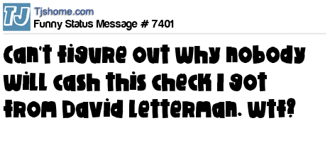 X can't figure out why nobody will cash this check I got from David Letterman. wtf?