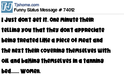 X I just don't get it. One minute their telling you that they don't appreciate being treated like a piece of meat and the next their covering themselves with oil and baking themselves in a tanning bed....... Women.