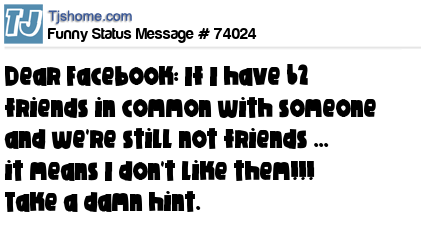 - # 52727 Hey Facebook, if I have 75 friends in common with someone and we're still not friends, it means I don't like them. Take a hint.