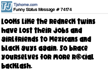 X says Looks like the redneck twins have lost their jobs and girlfriends to Mexicans and black guys again. So brace yourselves for more r@cial backlash.