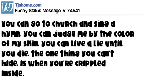 X You can go to church and sing a hymn, you can judge me by the color of my skin, you can live a lie until you die, the one thing you can't hide, is when you're crippled inside.