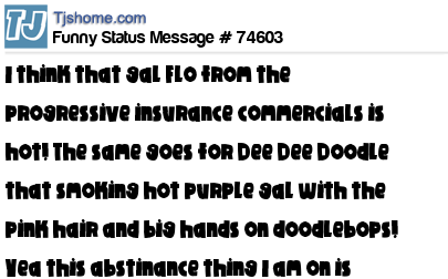 X is I think that gal Flo from the progressive insurance commercials is hot! The same goes for Dee Dee Doodle that smoking hot purple gal with the pink hair and big hands on doodlebops! Yea this abstinance thing I am on is working out great???!!!!