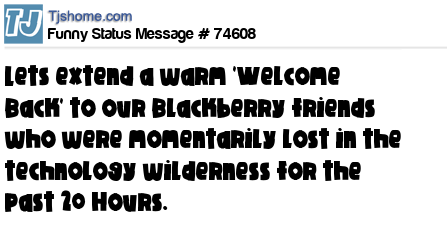 X is Lets extend a warm 'Welcome Back' to our Blackberry friends who were momentarily lost in the technology wilderness for the past 20 Hours.