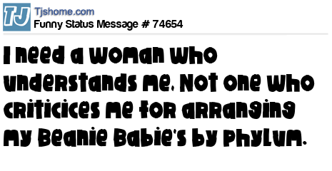 X I need a woman who understands me, Not one who criticices me for arranging my Beanie Babie's by phylum.
