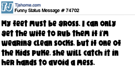 X My feet must be gross. I can only get the wife to rub them if i'm wearing clean socks, but if one of the kids puke, she will catch it in her hands to avoid a mess.