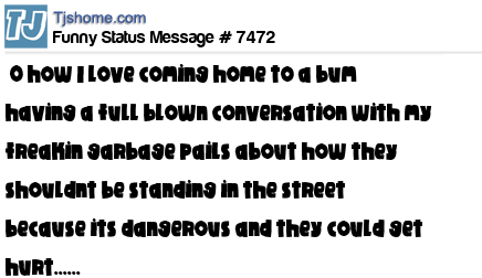 X says  O how I love coming home to a bum having a full blown conversation with my freakin garbage pails about how they shouldnt be standing in the street because its dangerous and they could get hurt......