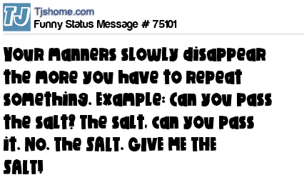 X Your manners slowly disappear the more you have to repeat something. Example: Can you pass the salt? The salt, can you pass it. No. The SALT. GIVE ME THE SALT!