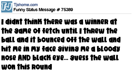 X I didnt think there was a winner at the game of fetch until I threw the ball and it bounced off the wall and hit me in my face giving me a bloody nose AND black eye... guess the wall won this round