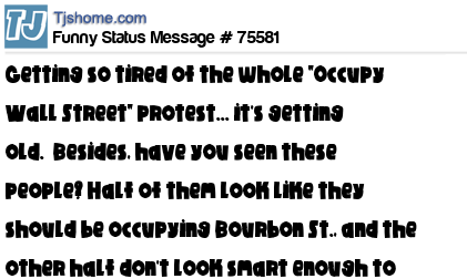 X  Getting so tired of the whole "Occupy Wall Street" protest... it's getting old.  Besides, have you seen these people? Half of them look like they should be occupying Bourbon St., and the other half don't look smart enough to occupy Sesame St...