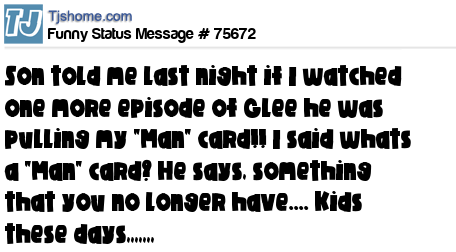 X is Son told me last night if I watched one more episode of Glee he was pulling my "Man" card!! I said whats a "Man" card? He says, something that you no longer have.... Kids these days,,,,,,,
