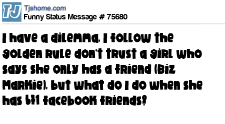 X is I have a dilemma, I follow the golden rule don't trust a girl who says she only has a friend (Biz Markie), but what do I do when she has 671 facebook friends?