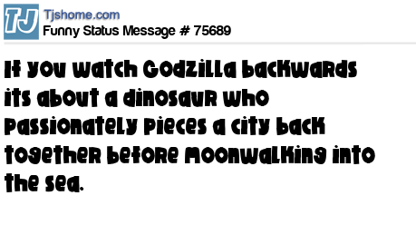 - # 88014 I just watched Godzilla backwards. It's like, it's about this dinosaur who insanely pieces a city back together, then moonwalks into the ocean.