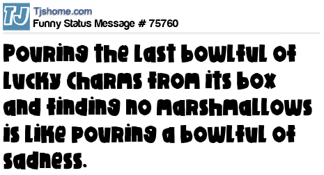 X  Pouring the last bowlful of Lucky Charms from its box and finding no marshmallows is like pouring a bowlful of sadness.