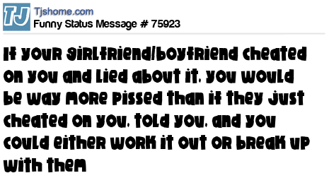 X If your girlfriend/boyfriend cheated on you and lied about it, you would be way more pissed than if they just cheated on you, told you, and you could either work it out or break up with them
