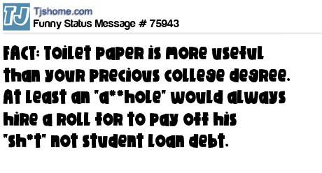 X FACT: Toilet paper is more useful than your precious college degree. At least an "a**hole" would always hire a roll for to pay off his "sh*t" not student loan debt.