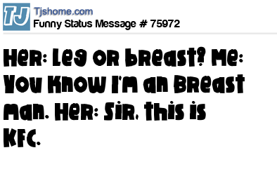 X is Her: Leg or breast? Me: You know I'm an Breast man. Her: Sir, this is KFC.