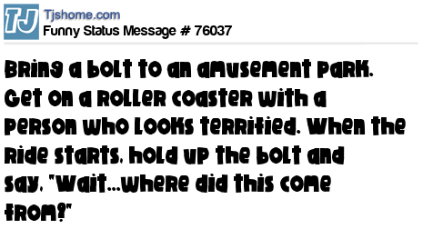 - # 97258 Next time you ride on a roller coaster, take some spare bolts with you and just as it starts to move, tap the person in front of you and say, "these just fell out of your seat." muhahahahaaa.,