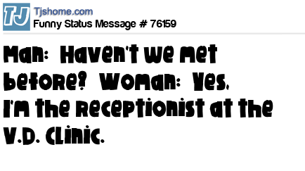 X  Man: “Haven't we met before?” Woman: “Yes, I'm the receptionist at the V.D. Clinic.”