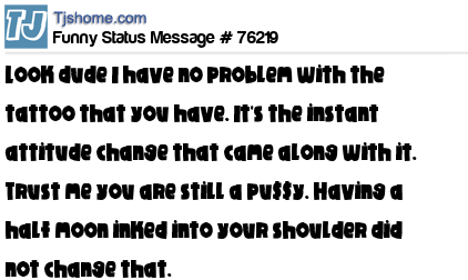 X Look dude I have no problem with the tattoo that you have. It's the instant attitude change that came along with it. Trust me you are still a pu$$y. Having a half moon inked into your shoulder did not change that.