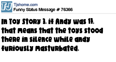 X  In Toy Story 3, if Andy was 17, that means that the toys stood there in silence while andy furiously masturbated.