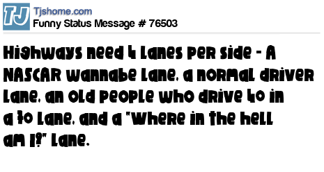 - # 76247 Highways need 4 lanes per side- A NASCAR wannabe lane, a normal driver lane, an old people who drive 40 in a 70 lane & a "where in the hell am I?" lane.