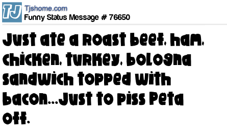 X Just ate a roast beef, ham, chicken, turkey, bologna sandwich topped with bacon...Just to piss Peta off.