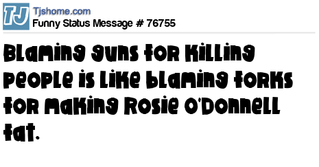 X says Blaming guns for killing people is like blaming forks for making Rosie O'Donnell fat.