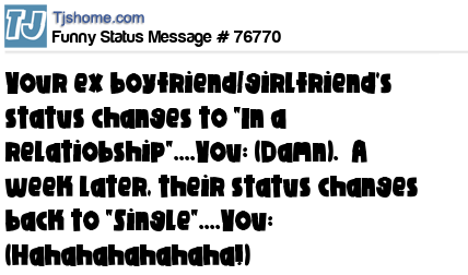 X  Your ex boyfriend/girlfriend's status changes to "In a relatiobship"....You: (Damn).  A week later, their status changes back to "Single"....You: (Hahahahahahaha!)