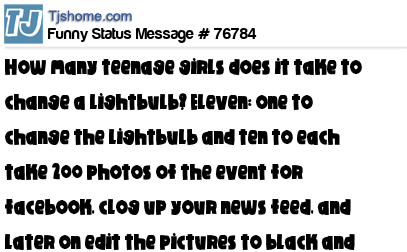 X How many teenage girls does it take to change a lightbulb? Eleven: one to change the lightbulb and ten to each take 200 photos of the event for facebook, clog up your news feed, and later on edit the pictures to black and white.
