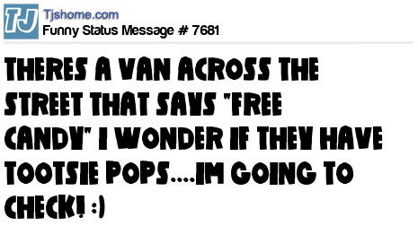 X is THERES A VAN ACROSS THE STREET THAT SAYS "FREE CANDY" I WONDER IF THEY HAVE TOOTSIE POPS....IM GOING TO CHECK! :)