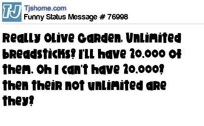 X Really Olive Garden, Unlimited breadsticks? I'll have 20.000 of them. Oh I can't have 20.000? then their not unlimited are they?
