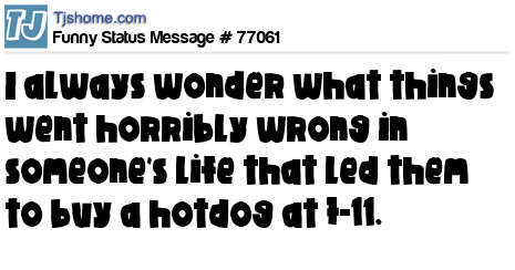 X I always wonder what things went horribly wrong in someone's life that led them to buy a hotdog at 7-11.