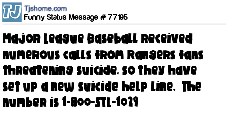 X Major League Baseball received numerous calls from Rangers fans threatening suicide, so they have set up a new suicide help line. The number is 1-800-STL-1029