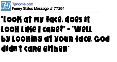 - # 127322 “Look at my face, does it look like I care?” – “Well by looking at your face, God didn’t care either.”