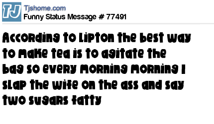 X says according to lipton the best way to make tea is to agitate the bag so every morning morning I slap the wife on the ass and say two sugars fatty
