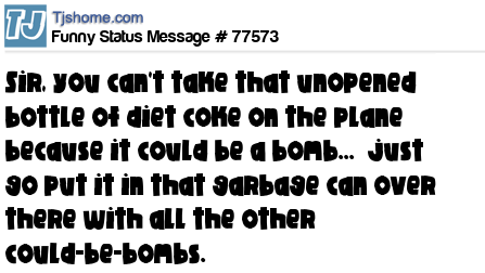 - # 77566 you can't bring a water bottle on a plane because it could be a bomb... but thats ok, just go put it in that garbage can overthere
