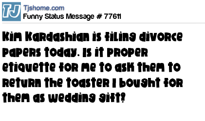 X Kim Kardashian is filing divorce papers today. Is it proper etiquette for me to ask them to return the toaster I bought for them as wedding gift?