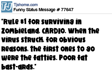 X  "Rule #1 for surviving in Zombieland, CARDIO. When the virus struck, for obvious reasons, the first ones to go were the fatties. Poor fat bast-ards."