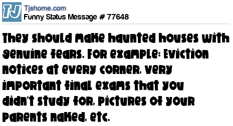 X They should make haunted houses with genuine fears. For example: Eviction notices at every corner, very important final exams that you didn't study for, pictures of your parents naked, etc.