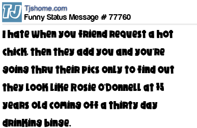 X I hate when you friend request a hot chick, then they add you and you're going thru their pics only to find out they look like Rosie O'Donnell at 75 years old coming off a thirty day drinking binge.