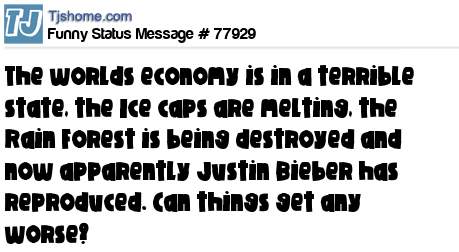 X is The worlds economy is in a terrible state, the Ice caps are melting, the Rain Forest is being destroyed and now apparently Justin Bieber has reproduced. Can things get any worse?