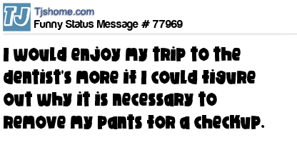 X I would enjoy my trip to the dentist's more if I could figure out why it is necessary to remove my pants for a checkup.