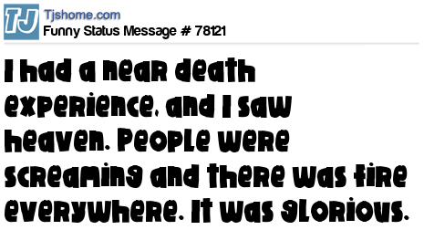X I had a near death experience, and I saw heaven. People were screaming and there was fire everywhere. It was glorious.