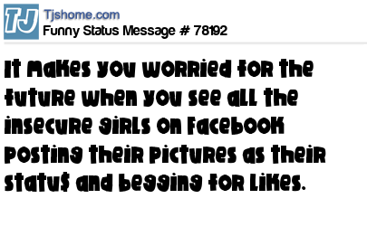 X  It makes you worried for the future when you see all the insecure girls on Facebook posting their pictures as their statu$ and begging for likes.