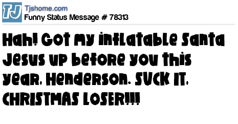 X Hah! Got my inflatable Santa Jesus up before you this year, Henderson. SUCK IT, CHRISTMAS LOSER!!!