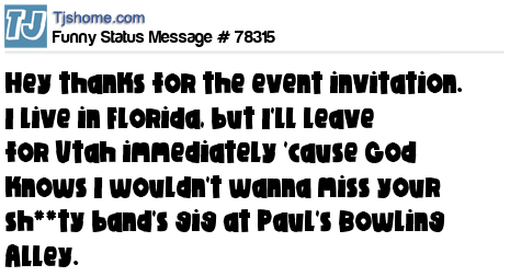 X Hey thanks for the event invitation. I live in Florida, but I'll leave for Utah immediately 'cause God knows I wouldn't wanna miss your sh**ty band's gig at Paul's Bowling Alley.