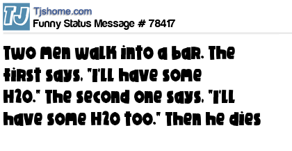 - # 78415 Two men walk into a bar. The first says, "I'll have some H2O." The second one says, "I'll have some H2O too." Then he dies..
