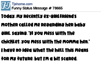 X is Today, my recently ex-girlfriend's mother called me regarding her baby girl, saying, "If you mess with the chicklet, you mess with the momma hen." I have no idea what the hell this means for my future, but I'm a bit scared.