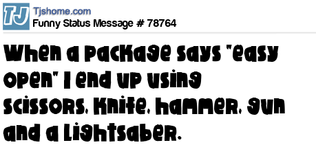 - # 66757 When a package says "Easy open" I end up using a knife, scissors, hammer, gun and a lightsaber.