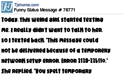 X is Today, this weird girl started texting me. I really didn't want to talk to her, so I texted back, "This message could not be delivered because of a temporery network setup error. Error 2128-226110." She replied, "You spelt temporary wrong."